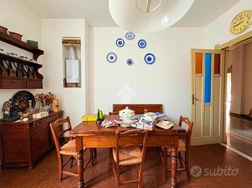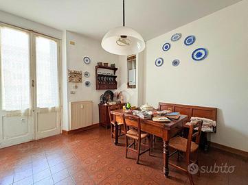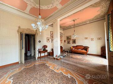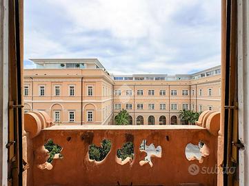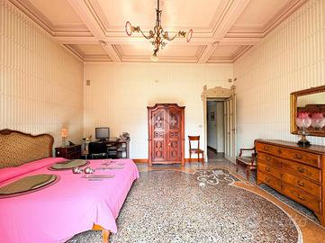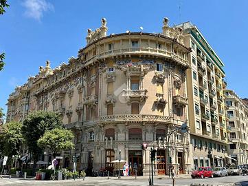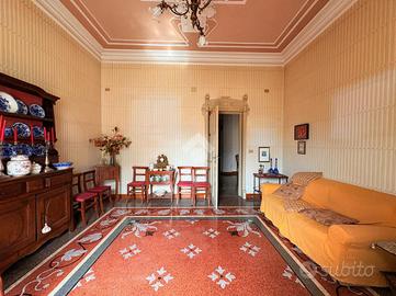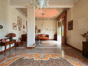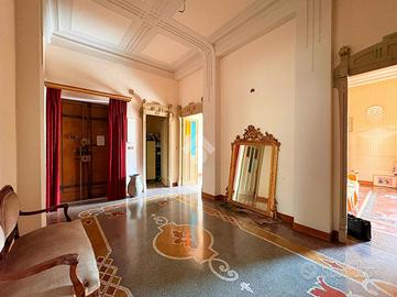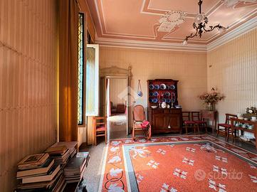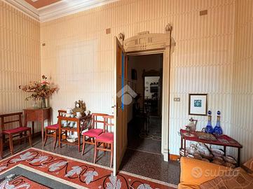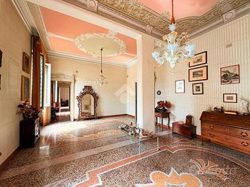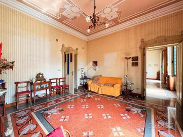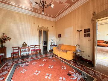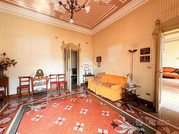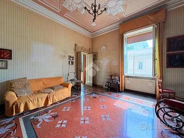 Il celebre 'Palazzo delle Piane', è un capolavoro architettonico firmato dall'ingegnere e architetto Alessandro Martinengo, realizzato nei primi anni del Novecento con la collaborazione Adolfo Ravignetti. La dimora storica è anche conosciuta come 'Palazzo delle palle' per via delle grandi sfere di rame situate sul tetto e sostenute da strutture a forma di bracere. Le sue decorazioni plastiche, le figure femminili che corrono lungo l'intero basamento, le maioliche nella cromia prevalente del blu e i balconi dalle elaborate ringhiere rendono l'edificio, uno dei massimi esempi di stile Liberty Fiorito. La posizione è invidiabile: il prospetto principale si affaccia su Corso Italia, l'elegante isola pedonale della città, a pochi passi dal mare e dal parco del Prolungamento, dalla fortezza del Priamar, dalle spiagge e da ogni servizio. Un parcheggio pubblico è comodamente situato nelle immediate vicinanze, rendendo la logistica semplice anche in pieno centro. Caldi giochi di luce accolgono il visitatore già nell'androne dell'edificio. L'ascensore in ferro battuto riprende armoniosamente di decori esterni della facciata. L'appartamento si trova al terzo piano di questo importante palazzo d'epoca. Un elegante ingresso conduce verso la zona giorno: un salone doppio, con affaccio su Corso Italia, La zona giorno è impreziosita dai soffitti affrescati e dagli stucchi che richiamano i raffinati dettagli dei mosaici degli originali pavimenti finemente conservati. La cucina abitabile, che completa la zona giorno, è spaziosa e funzionale, con dispensa separata e balcone privato. La zona notte ospita quattro camere da letto con soffitto a cassettoni, tutte matrimoniali, ampie e luminose, ideali per una famiglia o per chi desidera creare spazi studio e ospitalità. Completano la proprietà un comodo ripostiglio e due bagni finestrati, facilmente rinnovabili con stile e modernità. L'appartamento dispone inoltre di tre balconi, di cui uno caratterizzato dalla copertura a baldacchino..
