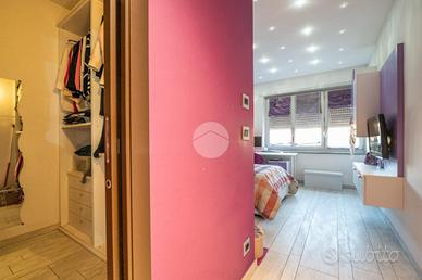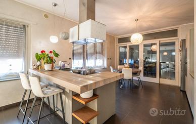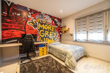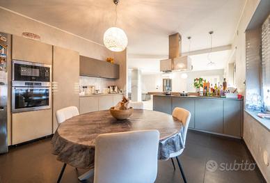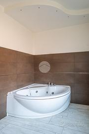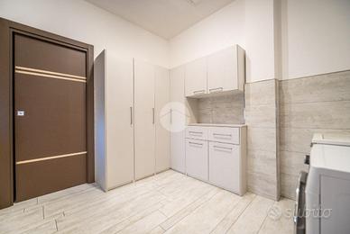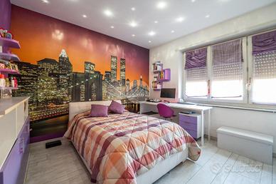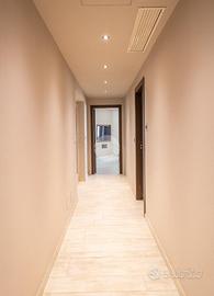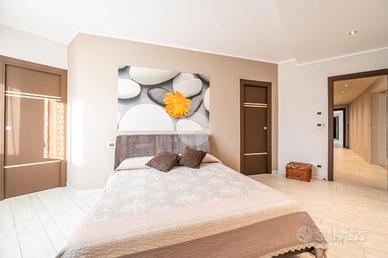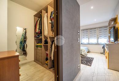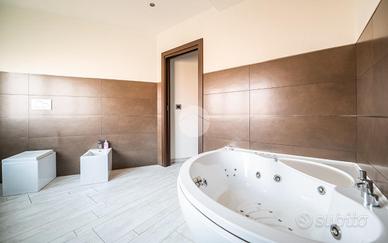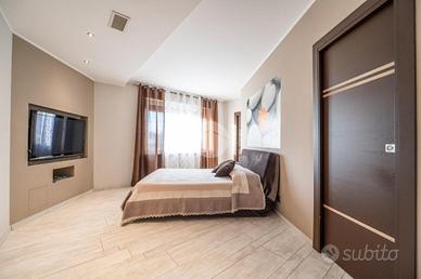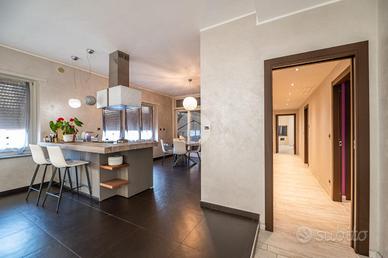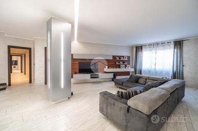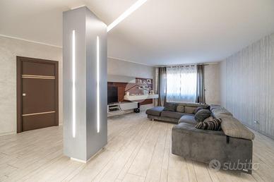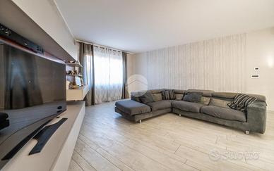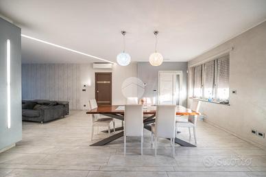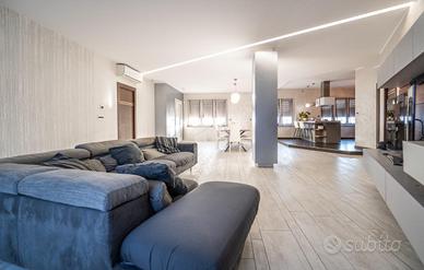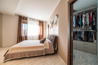 In zona centrale e comoda a tutti i principali servizi, l'appartamento gode di un accesso indipendente ed è situato al primo piano. Dalla porta blindata si accede all'ampia e luminosa zona giorno living con tavolo in legno e angolo TV con divano angolare. La cucina è in stile americano con penisola centrale e piastre a induzione. Il corridoio conduce alla zona notte composta dalle prime due camere da letto matrimoniali ognuna con cabina armadio personale e dalla camera patronale anch'essa con cabina armadio e spazio adibito a studio. Dalla zona lavanderia, dotata di attacchi per lavatrice e asciugatrice, si accede al primo bagno con doccia fuori misura. Il secondo servizio è munito invece di vasca idromassaggio. E' inoltre presente un terrazzo coperto di circa 30 mq. L'intera soluzione gode del riscaldamento a pavimento, terrazzo compreso e sono presenti i condizionatori che fungono anche da pompa di calore con impianto canalizzato sezionato per camera. Gli infissi sono in PVC con doppio vetro e le serrande sono motorizzate. E' stato inoltre installato un sistema domotico per la gestione coordinata di tutti i dispositivi (serrande, riscaldamento, luci...). L'alloggio è munito dell'impianto di solare termico per l'acqua calda sanitaria ed è presente un accumulatore di 300 litri. E' presente l'antifurto perimetrale e volumetrico. L'unità abitativa gode di una libertà sui quattro lati che conferisce un'ottimale luminosità agli ambienti. Al piano seminterrato troviamo una spaziosa cantina con attacchi dell'acqua e un ulteriore vano sfruttabile come tavernetta. A soli 50 mt dall'abitazione, completa la proprietà il box auto.