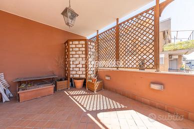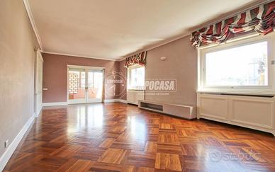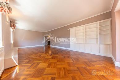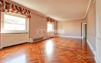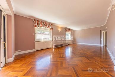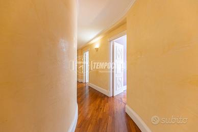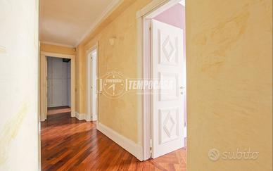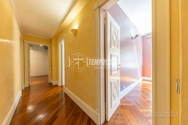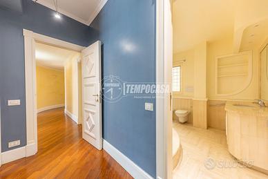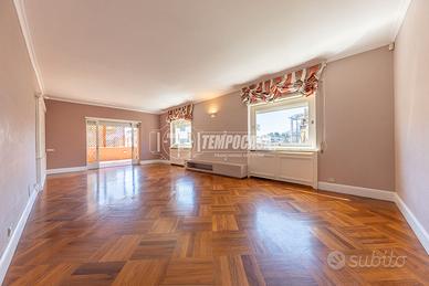 L'appartamento si sviluppa su una superficie di circa 200 mq, con una disposizione interna armoniosa e funzionale, che unisce rappresentanza e vivibilità quotidiana. L'ingresso principale introduce in un ampio disimpegno che si apre su un salone doppio, luminosissimo, grazie a due grandi finestre e una porta finestra che conduce a una terrazza abitabile, spaziosa e ben esposta, perfetta per godere di momenti di relax all'aperto o per accogliere ospiti in un ambiente riservato e gradevole. Adiacente al salone, e ben integrato nel cuore della zona giorno, si trova un ampio studio, ideale come spazio di lavoro o come ulteriore zona relax. Sempre dall'ingresso si accede alla cucina abitabile, comoda e ben organizzata, collegata a una zona di servizio completa di una piccola camera e un bagno dedicato.