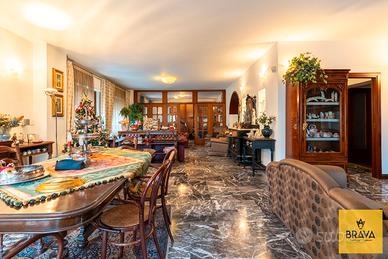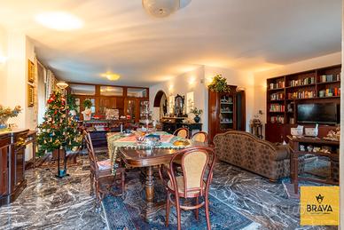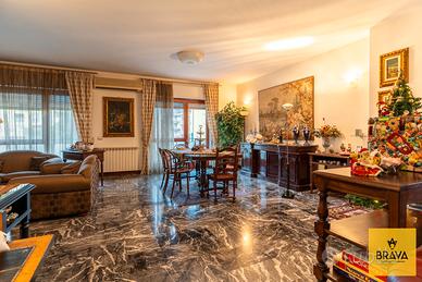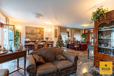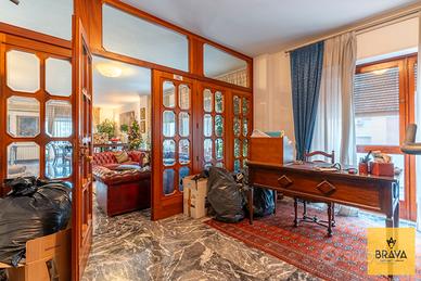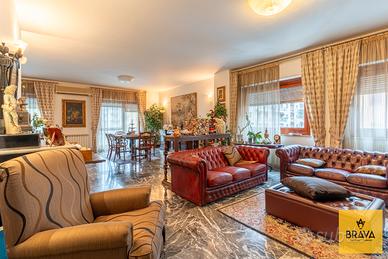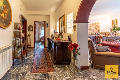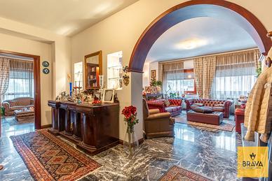 La presenza del doppio ingresso valorizza ulteriormente la funzionalità della casa: l'ingresso principale conduce a un ampio disimpegno che apre su un magnifico salone quadruplo, vero cuore dell'abitazione, impreziosito da una doppia esposizione su Via Cesareo e Via Leopardi e da due balconi che garantiscono luce naturale durante tutto l'arco della giornata. Gli spazi, ariosi e rappresentativi, sono esaltati dal pavimento in marmo grigio, che dona raffinatezza e continuità agli ambienti di rappresentanza.