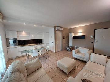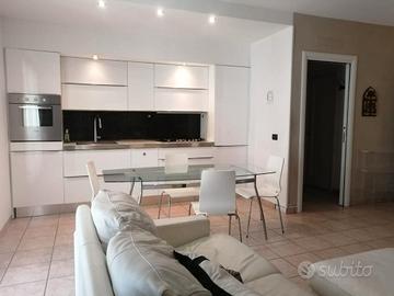 Arredamento moderno (divani bianchi di pelle), cucina completa di lavastoviglie, lavatrice.
