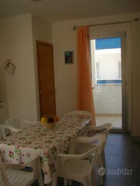 Dalla terrazza privata arredata con ombrellone, tavolo e sedie si accede alla sala da pranzo con cucina.