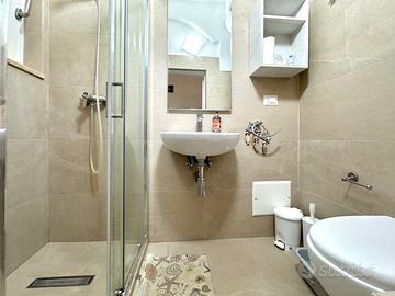 Proseguendo dalla scala comune, al primo piano, si accede alla seconda soluzione, anch'essa un bilocale ed entrando troviamo un ampia zona giorno con angolo cottura, ma a distinguere questa stanza è il bellissimo soffitto con volte a stella tipiche dell'epoca; continuando, una spaziosa camera da letto con volte a botte e con accesso al bagno finestrato, completo di lavabo, wc e box doccia.