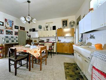 La cucina abitabile è spaziosa e ben organizzata, completa di angolo cottura, camino e tavolo da pranzo. Da qui si accede direttamente allo spazio esterno, in parte coperto, ideale per godersi le belle giornate all'aperto o parcheggiare comodamente più auto all'interno della proprietà.