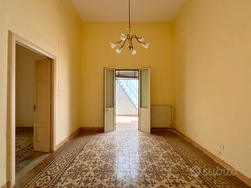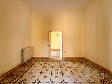 L'unità comprende cinque vani, tutti dotati di finestre. Due di questi sono particolarmente ampi e presentano storiche cementite dell'epoca, ognuno con affaccio sullo spazio esterno di proprietà, che conduce al secondo ingresso dell'immobile. Completano questo piano i doppi servizi, anche questi finestrati.