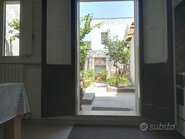 Galatina - Salento. In zona residenziale, abitazione con ingresso in comune al piano terra. La superficie totale della particella è di 180 mq, di cui 63 mq effettivi di giardino. Attualmente si configura con 2 camere da letto e una cucina abitabile, ma è possibile ricavarne anche una terza attualmente utilizzata come studio. Oltre al giardino e al bagno sono presenti 2 ammezzati, un piccolo cortile esterno che da luce a tutte le stanze e un garage condiviso fronte-strada, da cui si accede all'abitazione. L'unico spazio in comune con l'appartamento del primo piano è questo ingresso-garage, ma è possibile creare un ingresso indipendente sostituendo una finestra con una porta.