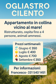 Affitto come privato un appartamento recentemente ristrutturato, situato a Ogliastro Cilento, in posizione strategica per raggiungere facilmente tutte le località più belle della costiera cilentana .