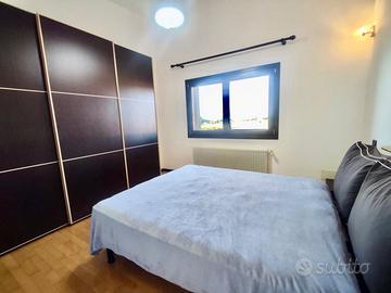 La camera matrimoniale è ampia e silenziosa, con parquet chiaro, armadio in legno scuro e finestra panoramica sulla terrazza.