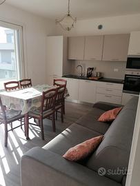 Affittasi lussuoso appartamento di circa 65mq , posto al secondo piano di una palazzina di nuova costruzione. L'appartamento si compone : soggiorno - cucina, ( arredato anche di comodissimo divano letto a due posti) due camere da letto ( 2+2 posti letto), bagno con piatto doccia, ampio terrazzo coperto che circoscrive l'appartamento, posto auto interno e comodissima cantina. Ogni ambiente è dotato di climatizzatore.