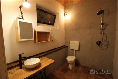 Bagno con doccia, wc e lavandino creato da vecchia macchina da cucire.
