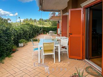 Dispone di tre camere da letto, due bagni, cucina abitabile, ampia sala, box auto e ampio giardino di proprietà esclusiva.