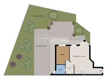 L'ingresso avviene sul grande soggiorno con angolo cucina, da qui si accede direttamente sul giardino privato, stessa cosa anche dalla camera, sullo stesso piano troviamo un bagno finestrato.