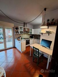 Composizione: ampio soggiorno luminoso, 2 bagni (uno con vasca idromassaggio), cucina abitabile (con ripostiglio che funge da angolo lavanderia), 3 camere da letto con pavimentazione in parquet, 3 terrazzi (di cui uno coperto, anche lateralmente, con tettoia in legno), 2 ripostigli.