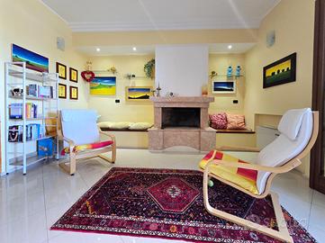L'ingresso si apre su un accogliente disimpegno che introduce nella spaziosa zona giorno, impreziosita da un camino che dona calore all'ambiente, perfetto per momenti di relax e convivialità.
