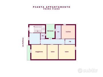 Avente una superficie complessiva coperta di circa 115 m² è composto da comodo ingresso, soggiorno, cucina abitabile, due stanze da letto, doppio servizio igienico, ripostiglio, comodo terrazzino a livello di circa 10 m² ed un balcone con affaccio sulla via pubblica.