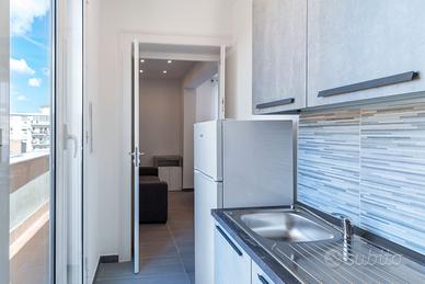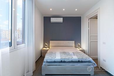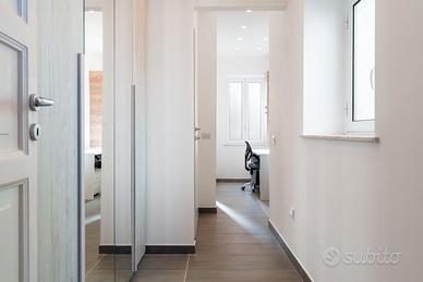 L'appartamento è completamente arredato e dotato di: porta blindata, infissi in alluminio con vetrocamera e persiane, condizionatore caldo/freddo nella camera matrimoniale, piano cottura a induzione, lavatrice, armadio, scarpiera e TV. Gli interni sono curati con pavimenti in grès grigio e porte in legno laccate bianche.