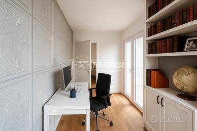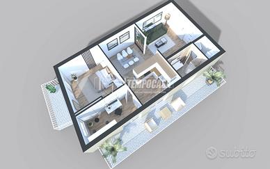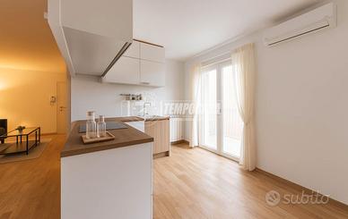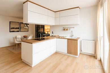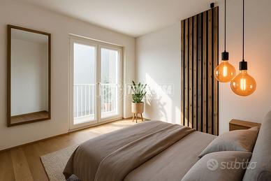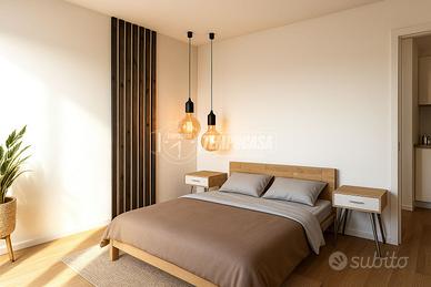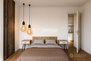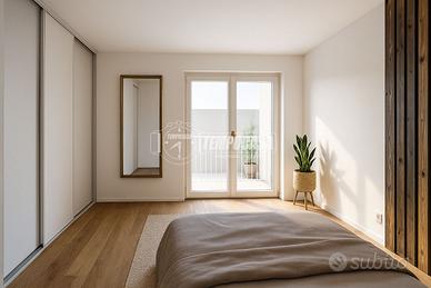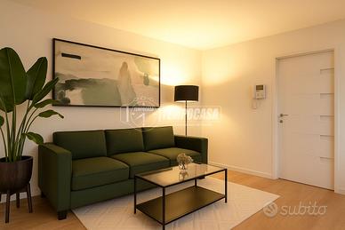 L'appartamento si apre su un generoso ingresso che introduce a un ambiente unico e arioso, dove convivono armoniosamente il soggiorno, l'angolo cottura e la zona notte. Da qui si accede direttamente a due balconi loggiati, che offrono un piacevole sfogo esterno e favoriscono la luminosità naturale durante tutto il giorno.