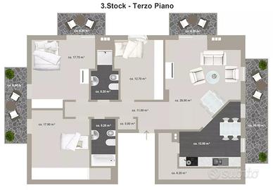 Rf.nr.: Z229 In posizione privilegiata a Selva Val Gardena, questo spazioso e curato quadrilocale al terzo ed ultimo piano conquista per la sua distribuzione degli ambienti ben studiata e per l'elevato comfort abitativo. L'immobile offre ampi spazi, ideali per famiglie o per acquirenti esigenti che ricercano generosità degli ambienti e un contesto abitativo di pregio. L'appartamento è composto da tre camere da letto, un accogliente soggiorno, una cucina separata e due bagni. Completano la proprietà un pratico ripostiglio e una dispensa, che garantiscono ulteriore spazio e rendono la vita quotidiana ancora più funzionale. Un vero punto di forza sono i quattro balconi, che offrono diverse esposizioni e piacevoli angoli soleggiati per momenti di relax all'aperto in ogni momento della giornata. Ulteriormente di proprietà dell'immobile vi è un ampio appezzamento di terreno di circa 106,6 m², che crea uno spazio esterno esclusivo. Una cantina di circa 7,90 m² offre ulteriore spazio di deposito. L'offerta è completata da tre posti auto, per comode soluzioni di parcheggio. A colpire particolarmente è l'ottima posizione che permette spostamenti rapidi con shuttle e autobus di linea per raggiungere qualsiasi meta, all'uscita di casa, come anche gli impianti sciistici facilmente raggiungibili a piedi, a pochissimi metri. L'immobile è stato oggetto di un'importante riqualificazione, con l'installazione del cappotto termico nel 2010 e la coibentazione del tetto e dell'impianto di riscaldamento nel 2011. L'appartamento si presenta in ottime condizioni manutentive e viene venduto arredato. Poiché l'immobile non è soggetto a convenzionamento, si presta perfettamente anche come seconda casa o casa vacanze, offrendo la massima flessibilità di utilizzo. Sup. commerciale: 162,00 m² Sup. netta: 113,30 m² Cantina: 7,90 m² Anno di costruzione: 1991 Ristrutturazioni: 2010 (cappotto termico), 2011 (riscaldamento + coibentazione tetto) Piano: 3° piano Riscaldamento: