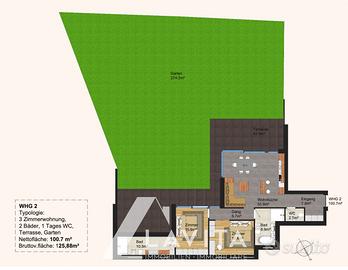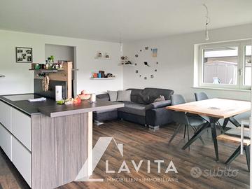 Doladizza: In una zona molto soleggiata, con esposizione completamente a sud, al piano terra di una palazzina di 10 appartamenti costruita nel 2022 secondo lo standard CasaClima A, proponiamo questo ampio trilocale con oltre 300 mq di giardino esterno.