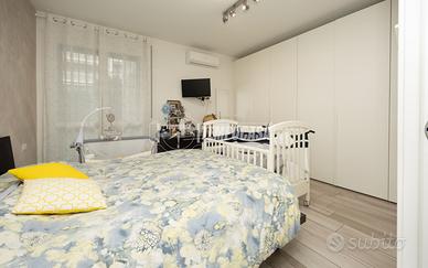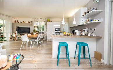Le ampie aperture verso il portico e il giardino, unite alla doppia esposizione sud / ovest, rendono questo spazio estremamente luminoso e arioso, dando la sensazione di vivere in una casa indipendente più che in un appartamento. Il portico coperto, completo di tenda da sole elettrica con sensore del vento, rappresenta una vera estensione del soggiorno, ideale per pranzi all'aperto, momenti di relax e convivialità.