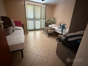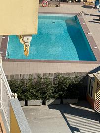 Casa con salotto-cucina-stanza Matrimoniale-stanzetta con 3 lettini e culletta x bambini,condizionatore/riscalsamento,bagno,balcone,ascensore,piscina.parcheggio auto con cancello automatico. 500 metri dal mare.100 metri dal supermercato