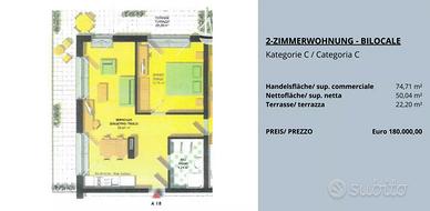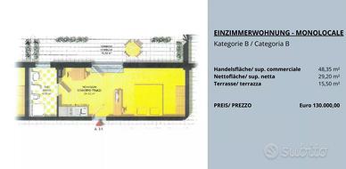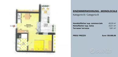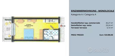 Abbiamo diversi appartamenti più piccoli con cantine e terrazze in vendita ad Andriano con un rendimento dell'8%. Si tratta di monolocali e bilocali che possono essere affittati a lungo termine, ma anche a turisti, in quanto l'autorizzazione è già stata concessa. Non è possibile mettere la residenza negli appartamenti. Gli appartamenti sono suddivisi in diverse categorie (vedi planimetrie) e partono da 120.000 euro.
