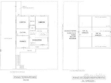 - Il secondo appartamento è posto al piano terra/rialzato con accesso da corte esclusiva, composto da ingresso, soggiorno, cucina, pranzo, disimpegno, due camere e un bagno.