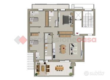 Ingresso in ampia zona giorno open space con salone e cucina a vista, entrambi con accesso diretto a un grande terrazzo vivibile, bagno di servizio con antibagno, disimpegno che conduce alla zona notte con tre comode camere da letto, di cui una con cabina armadio e tutte con uscita su balconi, ampio bagno principale e ripostiglio. Un posto auto scoperto.