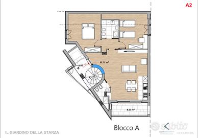 L'edificio si sviluppa su tre livelli, di cui l'interrato con i relativi box auto privati, piano terra A0,B0; piano primo A1,B1,C1, secondoA2, e mansardeC3, raggiungibili o con ascensore Schindler o dal corpo scale.