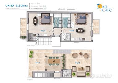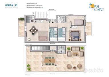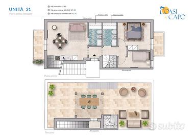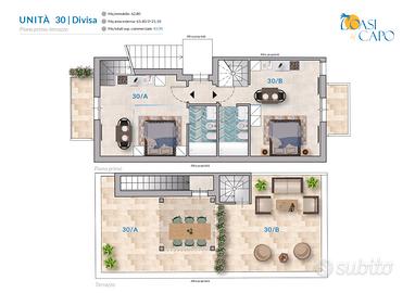 La soluzione adibita ad unico trilocale sarà composta al primo piano da disimpegno, zona living con cucina a vista e balcone, due servizi igienici finestrati, camera matrimoniale con balcone e cameretta, il secondo piano accessibile da una comoda scala interna sarà composta da un'ampia zona relax vista mare, personalizzata con doccia esterna e pergolato. La soluzione frazionata sarò composta al primo piano da due monolocali indipendenti composti entrambi da cucina-soggiorno con balcone, servizio igienico finestrato e camera da letto con balcone.
