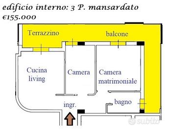 - Appartamento mansardato di 3 vani, composto da ingresso, cucina, 2 camere, bagno e ampia balconata,