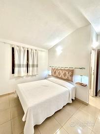 Camere matrimoniale ideale per due persone, luminosa e curata, con bagno privato interno. Arredata in stile sardo con colori neutri e dettagli artigianali, è dotata di aria condizionata, comodini con lampade e tutto il necessario per un soggiorno confortevole.