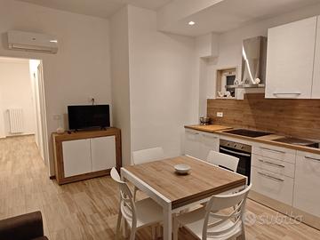 L'appartamento è completamente ristrutturato ed ammobiliato, mai abitato, dotato di bagno con ampio box doccia, ampia cucina completamente attrezzata (inclusi elettrodomestici, stoviglie, pentole, divano letto, ecc.), ripostiglio, vano lavanderia con lavatrice e lavatoio, ampia camera da letto con letto matrimoniale, armadio, comò e specchiera. L'appartamento ha impianto di riscaldamento autonomo a gas con radiatori e 2 climatizzatori caldo/freddo.