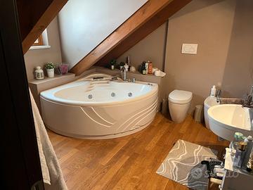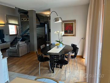 Privato vende in palazzina signorile di 4 appartamenti di recente costruzione. Appartamento al 2 piano con ascensore, disposto su due livelli composto di: ampio salone con zona pranzo e divani open space su cucina, 2 camere da letto, un bagno con ampia doccia, uno sgabuzzino, una lavanderia, 4 balconi di cui uno in cucina con tavolo da 6 persone. Piano mansardato con soppalco a vista: 2 camere da letto di cui una con cabina armadio, un bagno con vasca idromassaggio, uno studio e una zona relax. Appartamento molto spazioso e luminoso caratterizzato da ampie vetrate, pavimenti in legno, infissi in legno con doppi vetri, riscaldamento a pavimento. In più comodo e elegante camino a pellet e impianto di condizionamento con split caldo/freddo. Cantina di proprietà, locali tecnici comuni per ascensore, impianto addolcitore per acqua, e magazzino ripostiglio per attrezzi da giardino. Proprietà completamente cintata, ampio parcheggio privato, giardino comune con area attrezzata barbecue, area pranzo e relax arredata. Al piano interrato possibilità di garage sia singolo che doppio completamente al riparo con accesso diretto in ascensore.