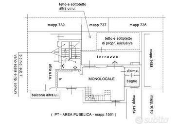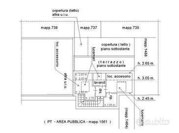Lalloggio risulta caratterizzato dai seguenti locali: monolocale al piano secondo con disimpegno e bagno, oltre terrazzo al piano e ripostiglio esterno sotto falda di copertura. Attraverso scala interna di collegamento si accede piano terzo sovrastante composto da due locali accessori, ripostiglio e lavanderia.