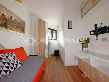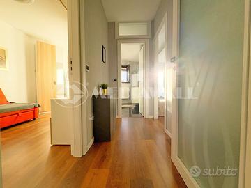L'appartamento, esposto a sud-ovest si trova al secondo piano servito da ascensore, costituito da: ingresso, corridoio che suddivide gli spazi nella zona giorno open-space, camera matrimoniale, bagno finestrato con doccia, cameretta, generoso terrazzo angolare in parte verandato e soffitta già rifinita che può essere usata come studio.