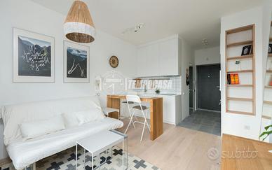 L'ingresso si apre su un luminoso soggiorno con angolo cottura, pensato per garantire comfort e funzionalità nella vita quotidiana.