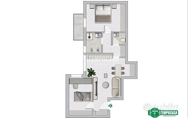 La zona notte è composta da due camere da letto, di cui una con accesso diretto al balcone, e due bagni moderni e ben rifiniti.