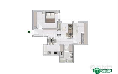 L'ingresso si apre su un luminoso soggiorno con angolo cottura, pensato per garantire comfort e funzionalità nella vita quotidiana.