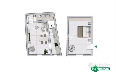 L'appartamento si sviluppa tra piano terra e piano seminterrato, collegati internamente da una scala a chiocciola.