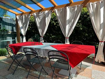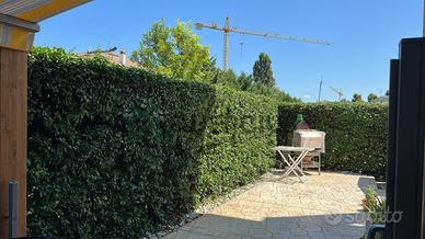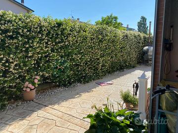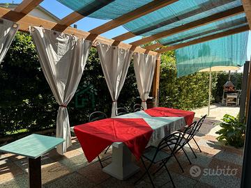 Il giardino è recintato, piantumato con pompeiana fuori dalla zona giorno per poterlo sfruttare per pranzi/cene all'aperto e casetta di legno per gli attrezzi.