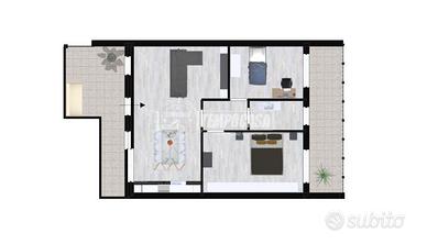 L'abitazione è composta da ingresso su soggiorno con cucina open space, disimpegno, bagno moderno, cameretta e camera matrimoniale.