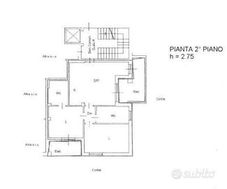 L'immobile è situato al piano secondo, composto da soggiorno con angolo cottura, disimpegno, due camere, due servizi igienici e due balconi nonché vano di cantina al piano interrato.