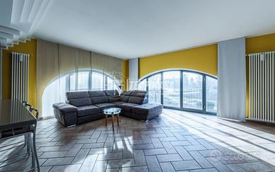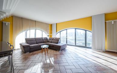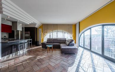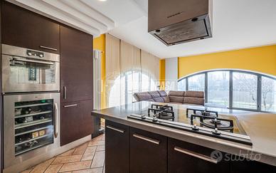 Zona giorno open-space con arredi su misura, ampie vetrate ad arco e grande luminosità naturale