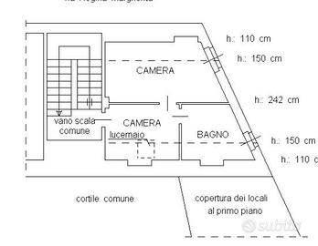 Trattasi di appartamento posto al piano primo (secondo fuori terra) è composto da ingresso su corridoio da cui si affacciano i locali camera, bagno, cucina, soggiorno e balcone che si prospetta su cortile comune. Tramite la scala comune si accede al piano secondo-sottotetto (terzo fuori