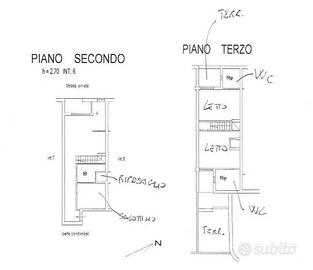 Al secondo piano si compone di un soggiorno con angolo cottura, un bagno, un ripostiglio, un salotto ed un terrazzo. Il terzo piano, raggiungibile tramite scala interna, consta invece di due camere da letto, due W.C., e due terrazzi.