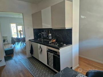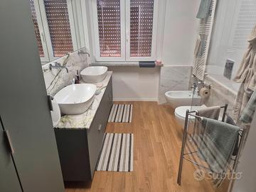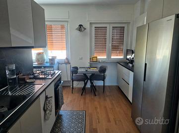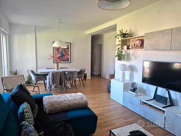 Appartamento di 118 mq 1° piano sul rialzato ristrutturato interamente nel 2023 + 2 ripostigli; Parzialmente arredato con cucina Lube; Tre camere da letto, cucina, soggiorno, ripostiglio. Doppi servizi igienici di cui bagno padronale con parquet, rivestimenti in marmo, sanitari e rubinetterie di pregio, doccia walk-in, bagno di servizio con pavimento in gres completo di comoda doccia; Parquet di pregio in tutta la casa; Infissi esterni in pvc, avvolgibili elettriche, zanzariere e cassonetti filomuro coibentati; Porte interne marca Scrigno con cerniere a scomparsa e serratura magnetica; Impianto elettrico nuovo dotato di certificazione di conformità; Impianto termico nuovo con radiatori dotato di certificazione di conformità; Caldaia a condensazione dotata di termostato WiFi per la gestione da remoto; A servizio dell'abitazione due comodi ripostigli al piano superiore di mq 15 ognuno dotati di nuovi infissi;