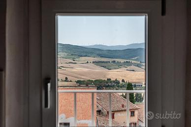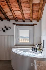 Sali le scale d'epoca ed entri in una zona giorno attrezzata, con cucina e tavolo da pranzo. Il soffitto a travi in noce e il parquet moderno uniscono tradizione e design. La camera matrimoniale con bagno en suite ospita un ambiente ampio, con vasca idromassaggio e doccia, che rende l'appartamento una suite esclusiva e romantica. Completa il tutto la vista panoramica sulle campagne toscane.
