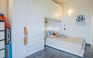 L'ingresso si apre su un ampio e luminoso soggiorno con cucina a vista su misura, perfettamente integrata nello spazio. Un corridoio conduce alla zona notte composta da due camere matrimoniali, di cui una padronale dotata di cabina armadio, e da un bagno spazioso e ben distribuito. Tutti gli ambienti godono di accesso diretto ai terrazzi con vista panoramica su Lavagna e sul mare, incluso un balcone vivibile collegato alla zona giorno, ideale per momenti di relax all'aperto.