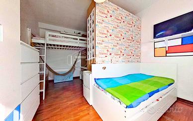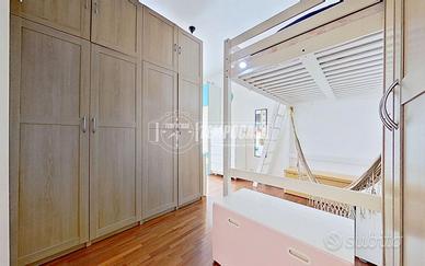 Proseguendo verso la zona notte troviamo una camera matrimoniale di generose dimensioni, anch'essa caratterizzata da una piacevole luminosità. Attualmente è stata organizzata con un armadio divisorio per ricreare due ambienti distinti, soluzione ideale per chi necessita di uno spazio studio, una cabina armadio o una cameretta. La configurazione può comunque essere facilmente riportata a un'unica ampia stanza matrimoniale.